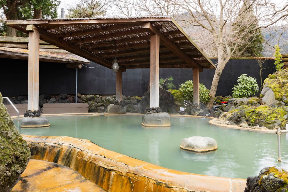 阿蘇外輪山入り口に位置する当館は、約1,000坪の広大な浴場に13もの湯船と露天風呂を完備。緑白色の美人の湯として知られる硫酸塩泉は、疲労回復から美肌効果まで多彩な効能があります。